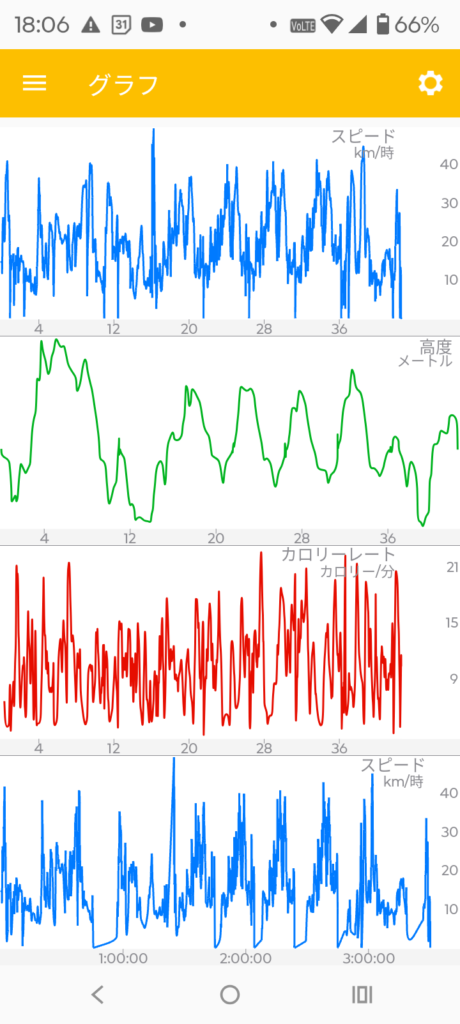 アップダウンのあるコースだったので、スピードやカロリーのグラフもきれいに波を描いていました。